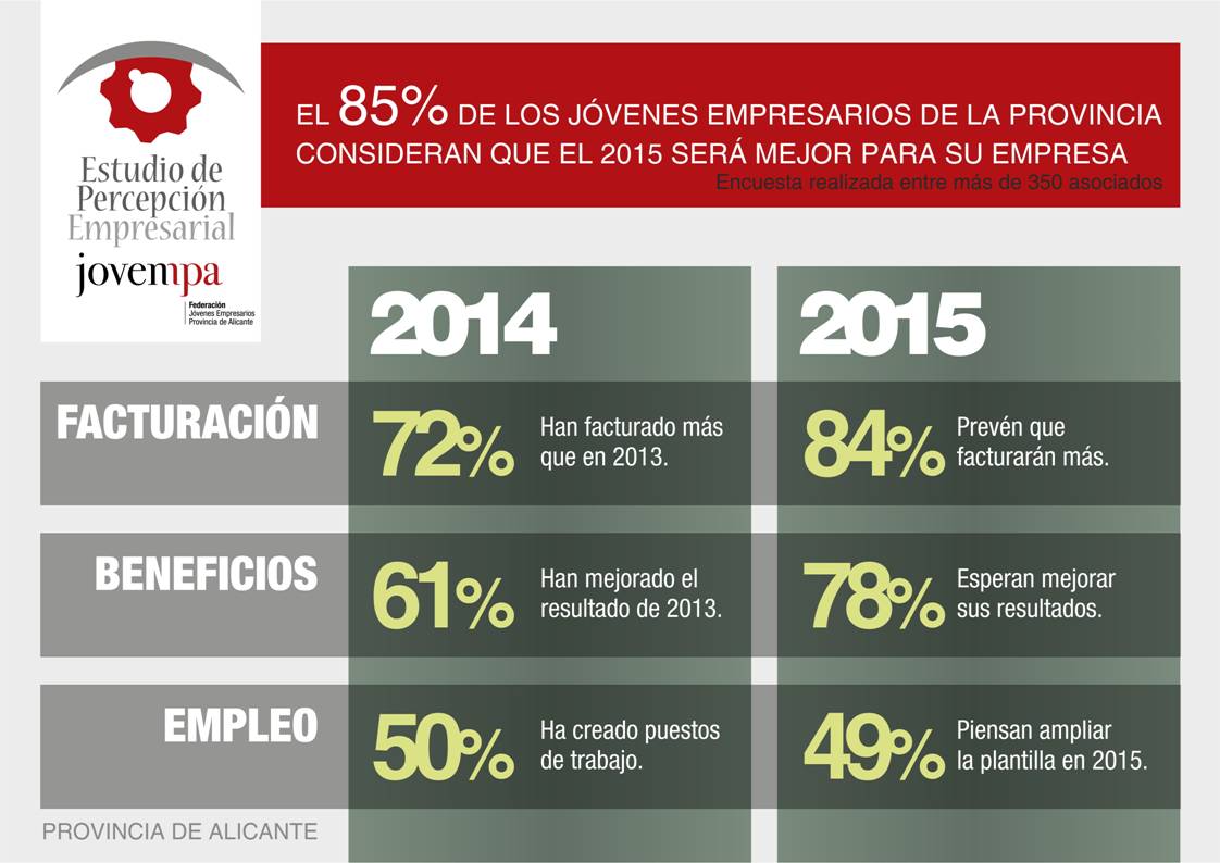 Alicante, 01/06/2015.- Durante los primeros meses de este año, la Federación de Asociaciones de Jóvenes Empresarios ha realizado un estudio entre sus empresas asociadas, con el fin de conocer los resultados del año 2014 y su percepción en relación al año 2015, siendo los resultados muy positivos.